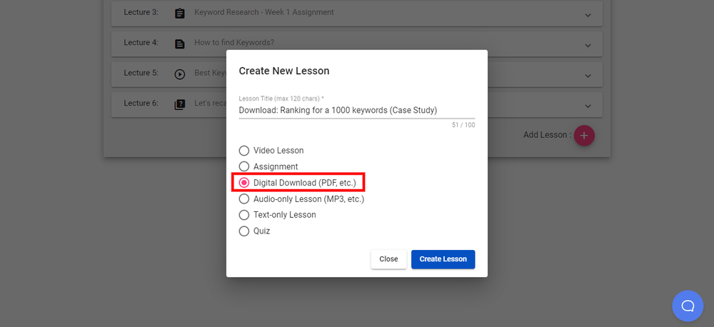 There are different kinds of material for students to learn, such as PDFs, digital downloads, audio lessons, video lessons, rich-text lessons, and more.
